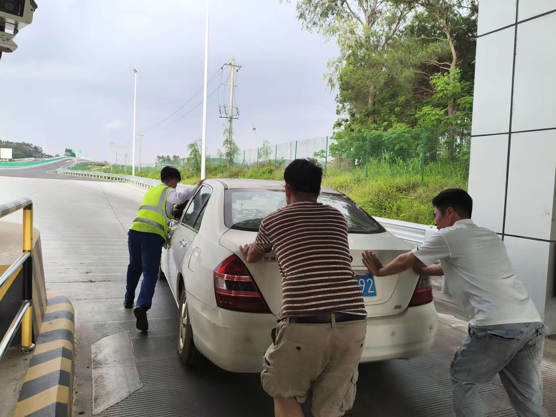 6月14日15時許,在林橫高速洋橋收費站,一輛小轎車在下高速時因發(fā)動機(jī)故障滯留在車道中并伴有白煙冒出,因事發(fā)時正逢暴雨,情況險急。當(dāng)班收費員周秋吉、吳星煒察覺異常后第一時間上報監(jiān)控中心并開啟備用車道,迅速引導(dǎo)后方車流安全有序轉(zhuǎn)移,同時取用滅火器隨時準(zhǔn)備應(yīng)對突發(fā)情況。在確認(rèn)車輛無法啟動且白煙仍在持續(xù)冒出時,收費員冒雨協(xié)同司乘將車輛推離車道,轉(zhuǎn)移至收費站外廣場安全地帶停放,并幫助司乘聯(lián)系拖車,暖心服務(wù)讓司乘連連“點贊”。
